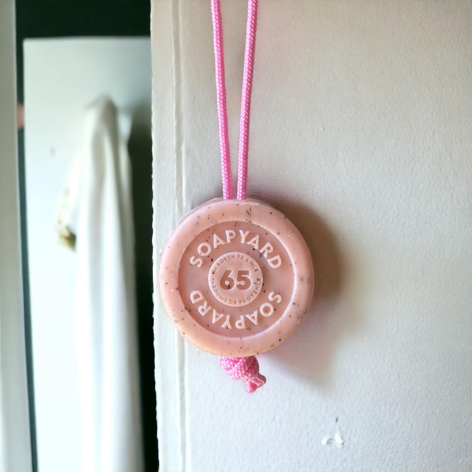 This is a triple-milled French artisan-made bar soap. You have the option to use it as a soap-on-a-rope with a handy hanging cord, or as a traditional bar without the rope. It makes a lovely unique gift and can be purchased with rope, tin and cotton bag, or just the bar alone.