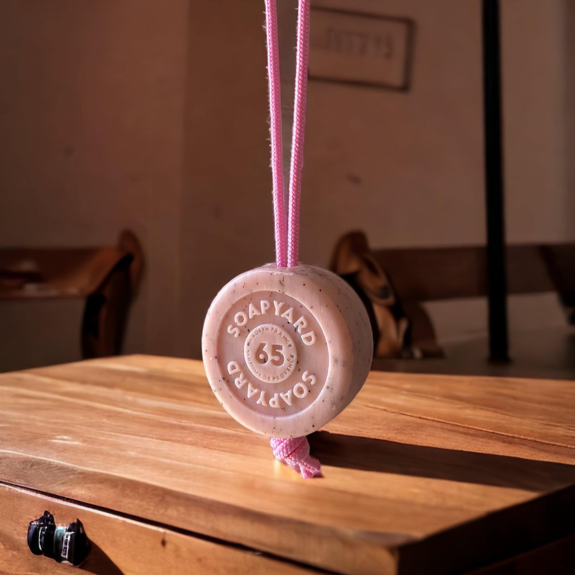 The soap can be used as a soap-on-a-rope, with a wall magnet, or as a regular round bar soap in a soap dish. The hole through the middle - like all our bespoke bars enables you to use it with a handy interchangeable rope perfect for hanging and keeping the soap hygienic and dry between uses.