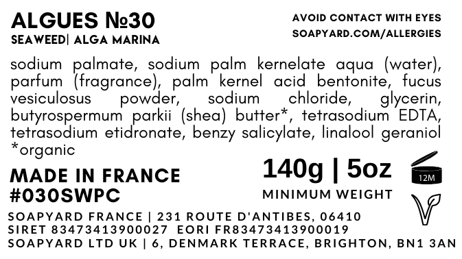 INCI:  sodium palmate, sodium palm kernelate, aqua (water), parfum (fragrance), palm kernel acid, bentonite, fucus vesiculosus powder, sodium chloride, glycerin, butyrospermum parkii (shea) butter*, tetrasodium EDTA, tetrasodium etidronate, benzyl salicylate, linalool, geraniol